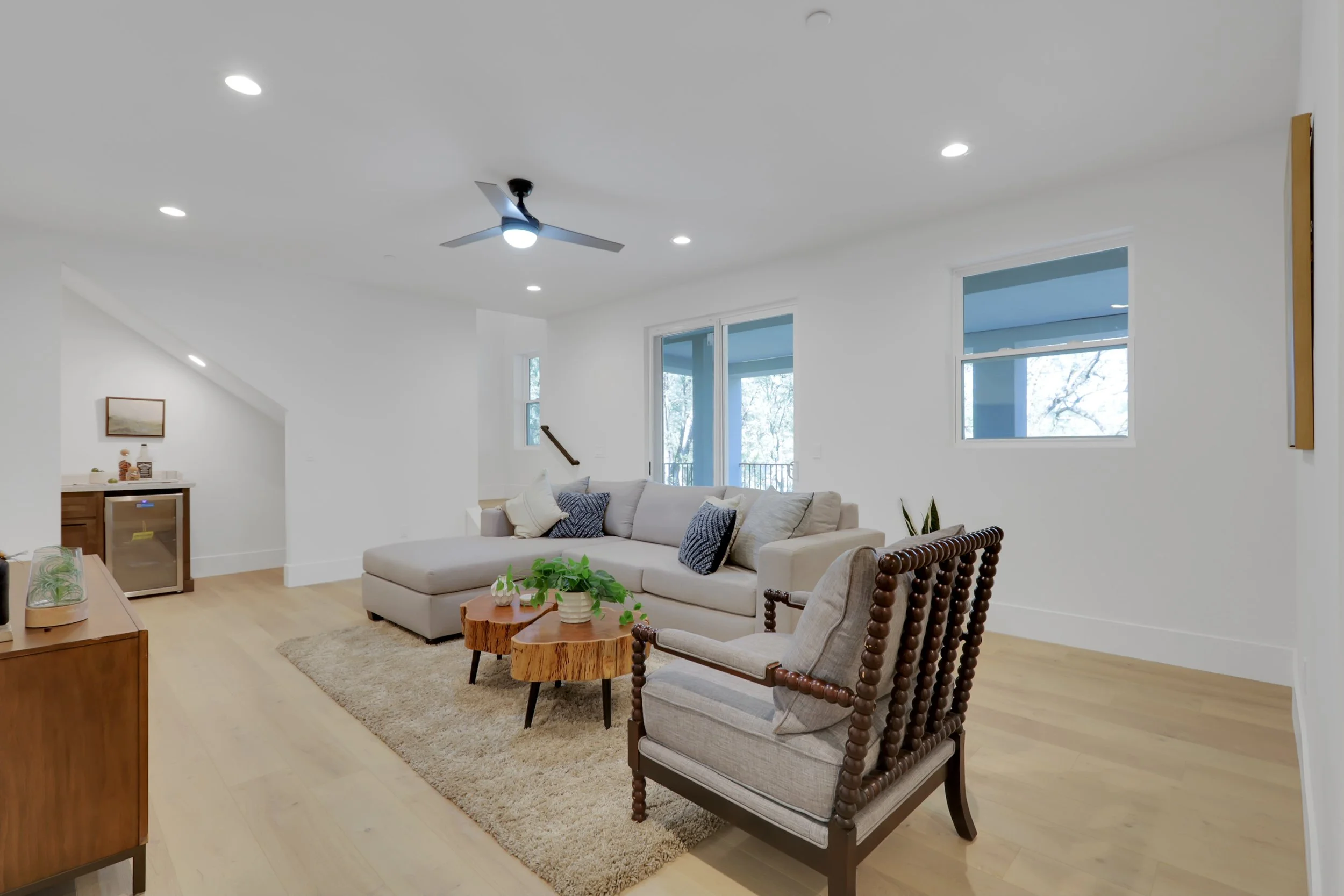 A warm and inviting lounge designed for connection and comfort. The natural wood accents, soft textures, and built-in wet bar create the perfect space for relaxed evenings or casual gatherings.