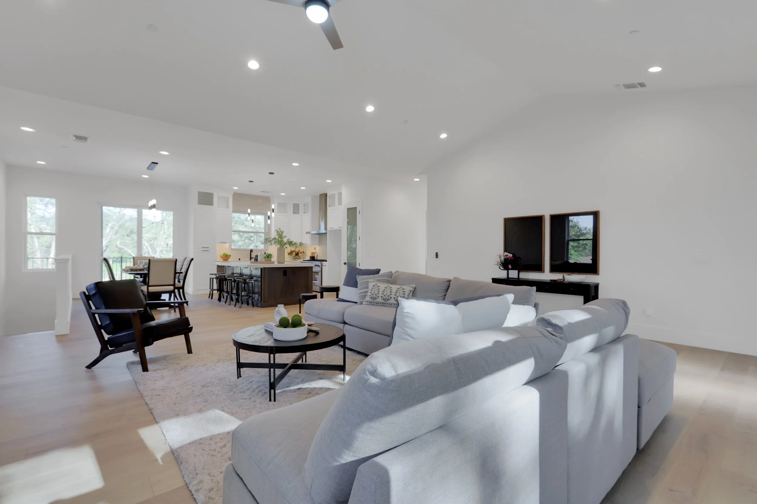 This inviting open floor plan seamlessly connects the living room, dining space, and kitchen — ideal for both everyday living and entertaining. The natural light enhances the neutral tones and soft textures, while the modern furniture and subtle décor create a warm, sophisticated atmosphere. A perfect blend of comfort and contemporary design.