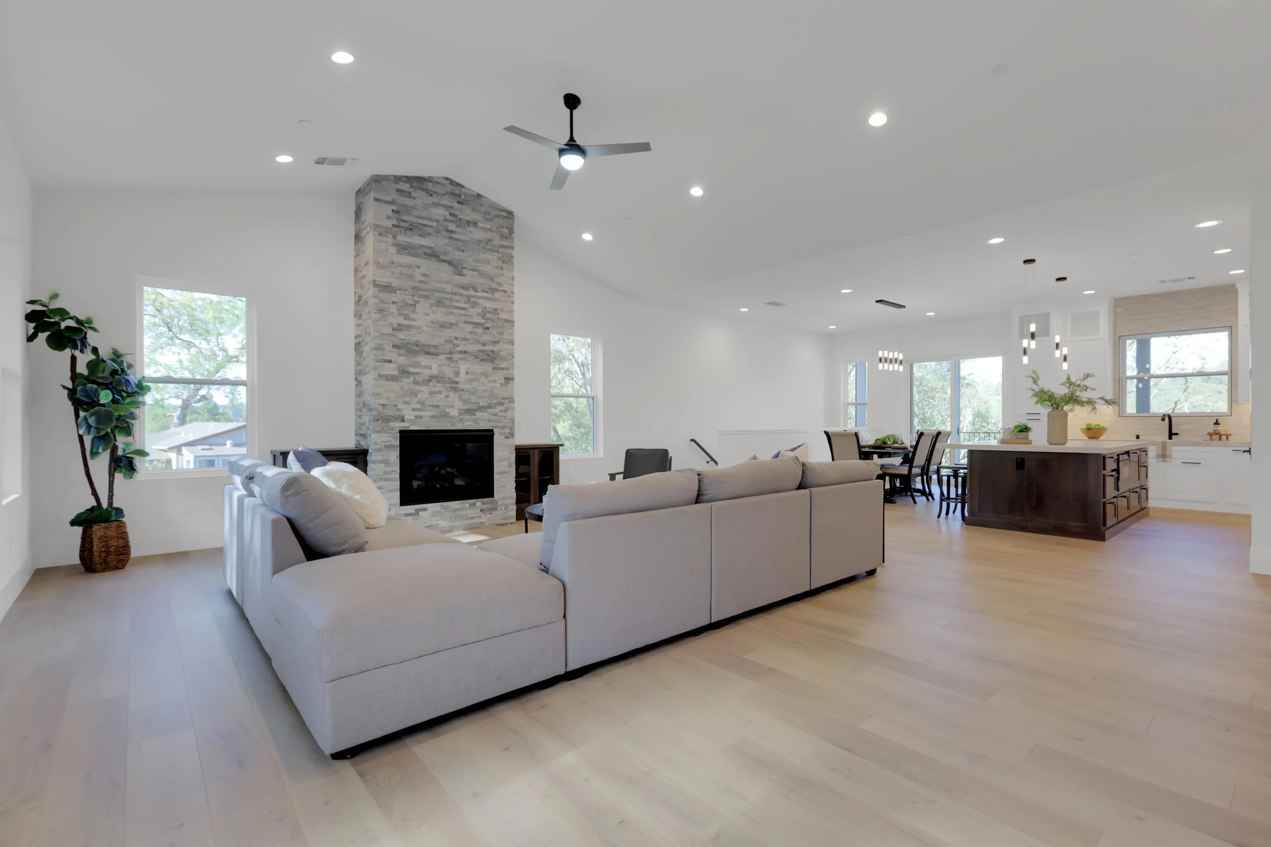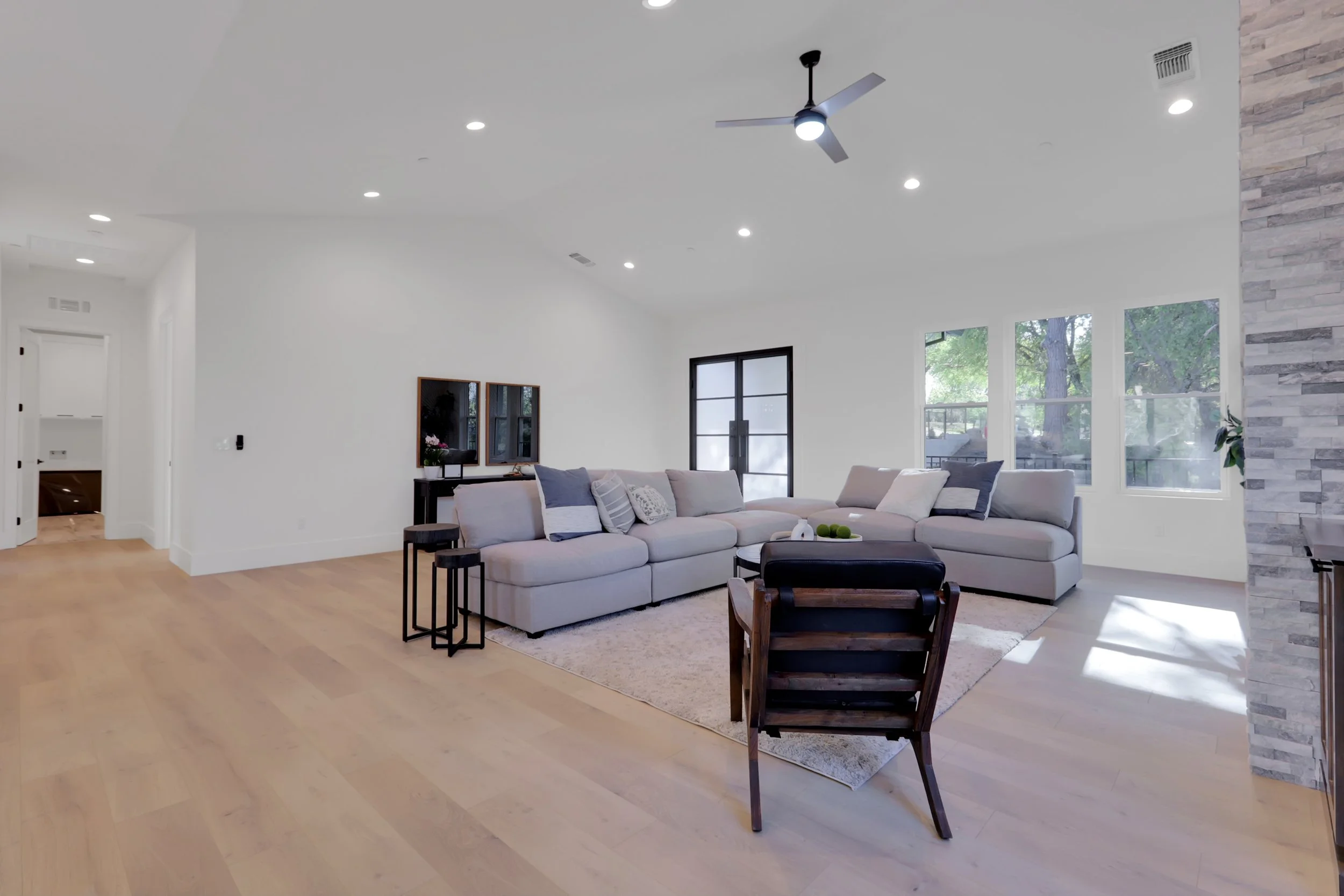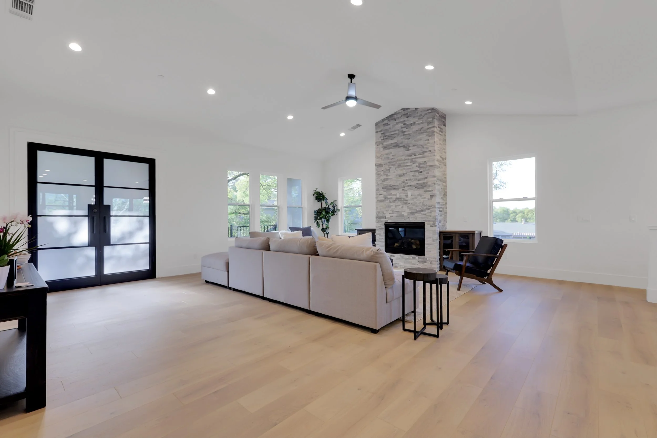 Spacious and bright, the living room blends comfort with refined design. Soft natural light flows through large windows and glass doors, highlighting the light oak floors and high ceilings. A stone-accent wall adds texture and warmth, while the open layout invites relaxation and effortless connection with the rest of the home.