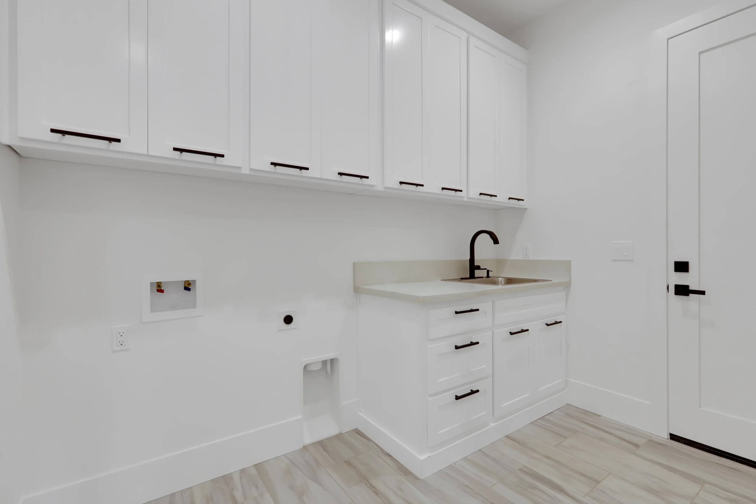 Bright and functional laundry room with ample cabinet storage, sleek countertops, and a modern black faucet for a clean, organized look.