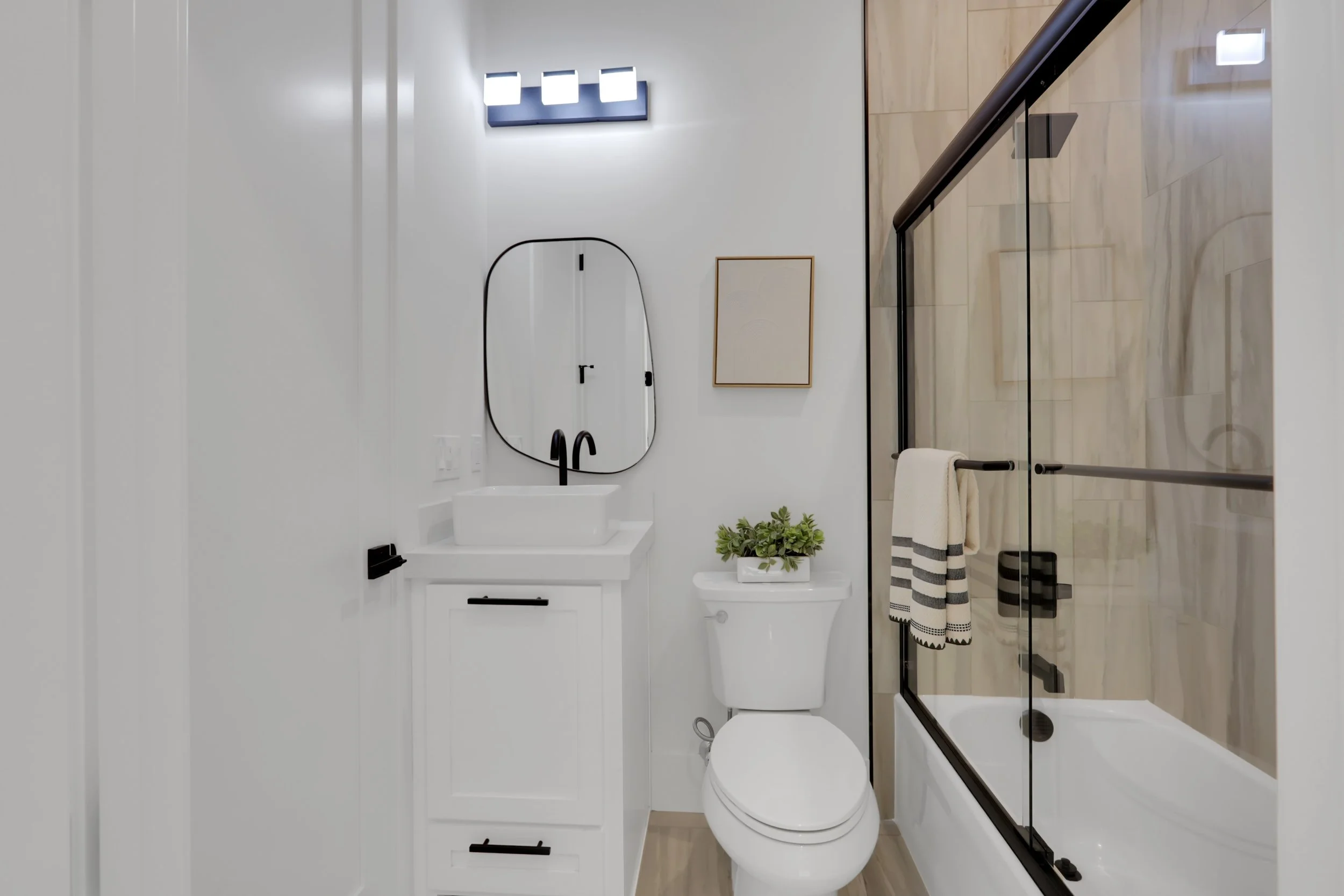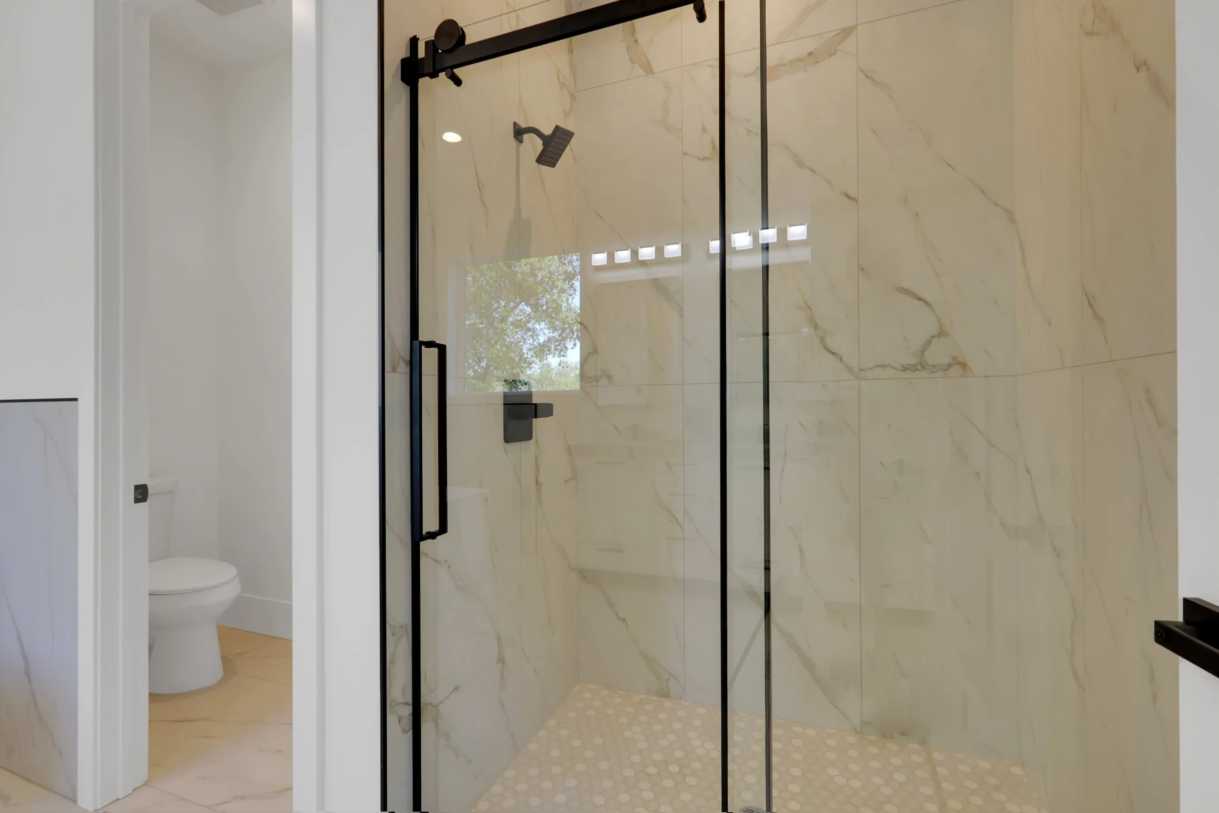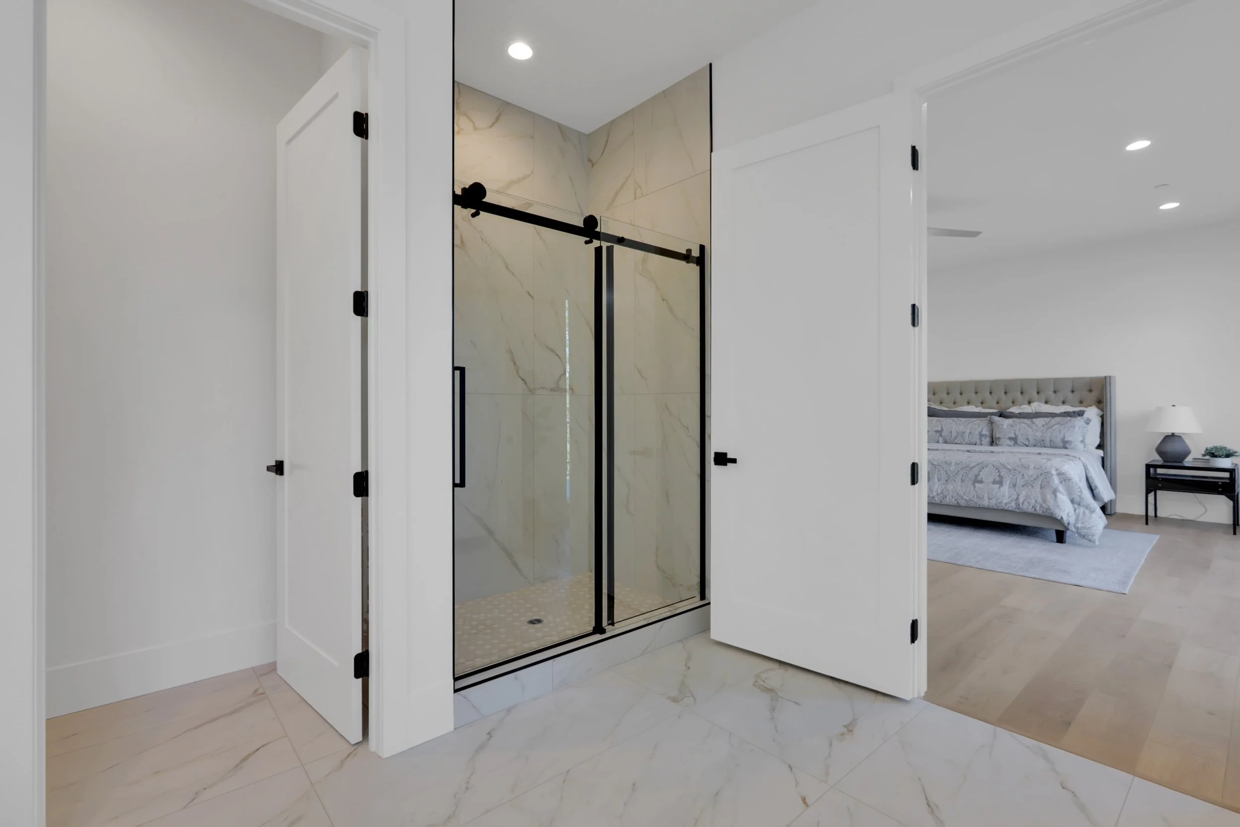Sleek walk-in shower with modern black hardware, opening directly into the spacious primary bedroom for a seamless, luxurious flow. -