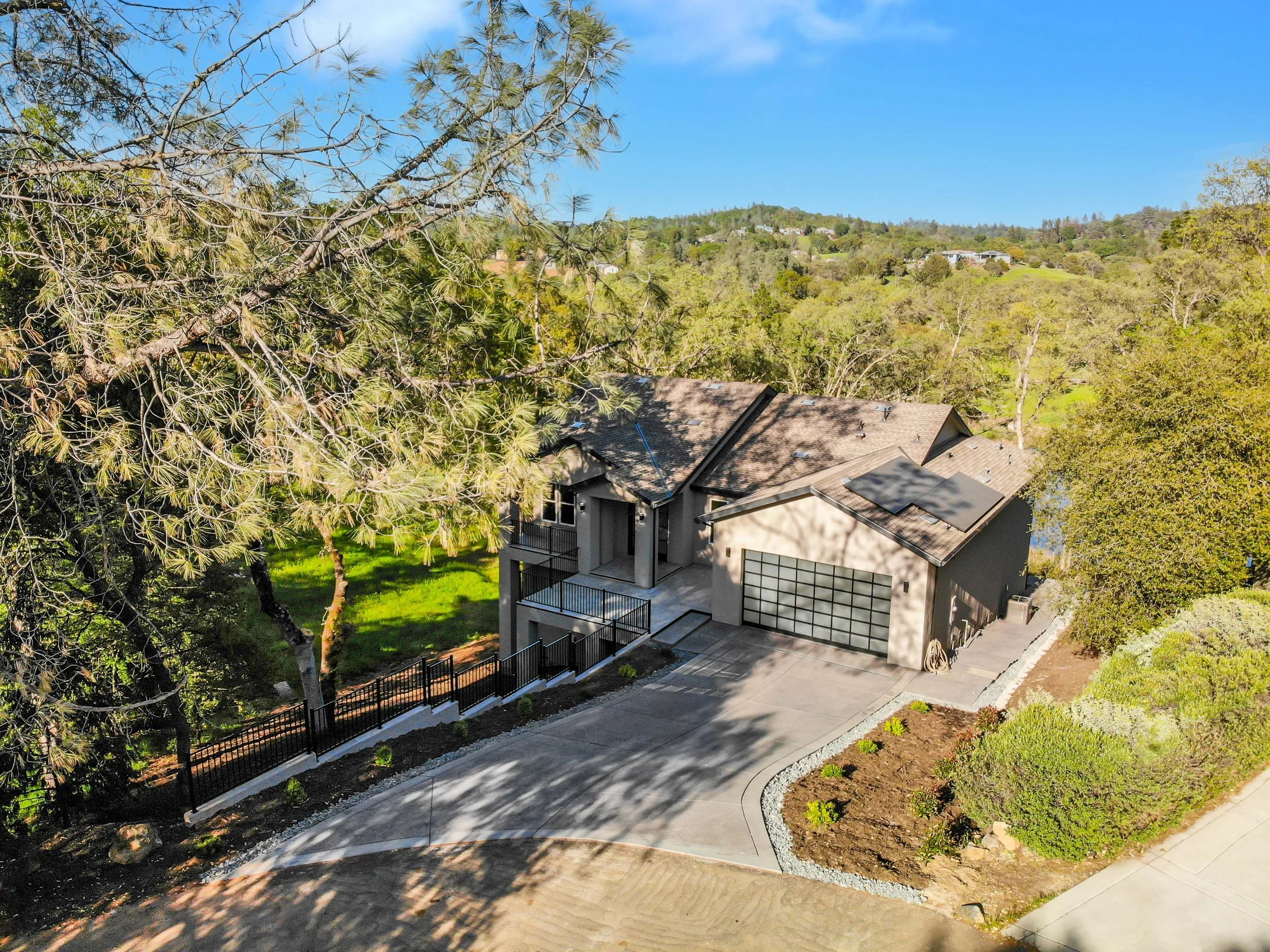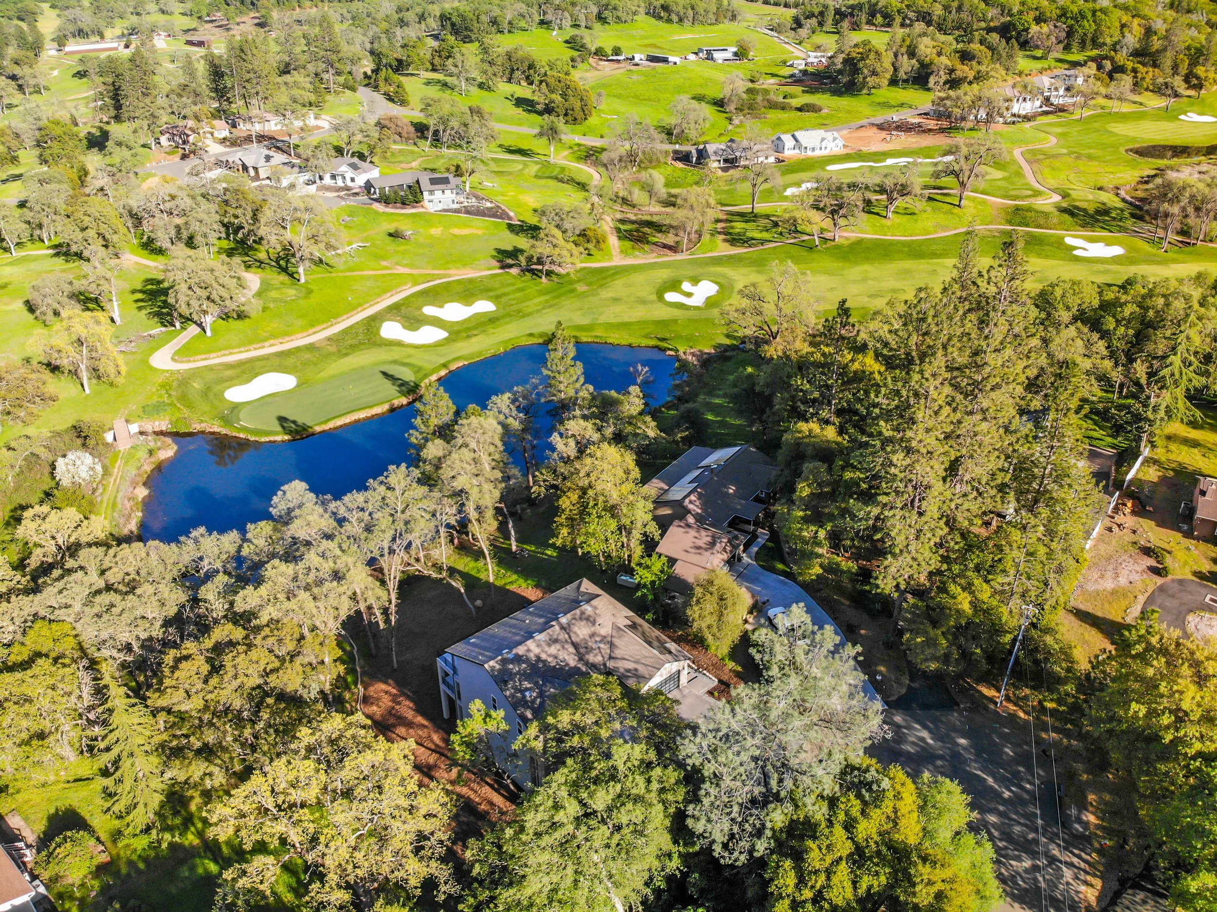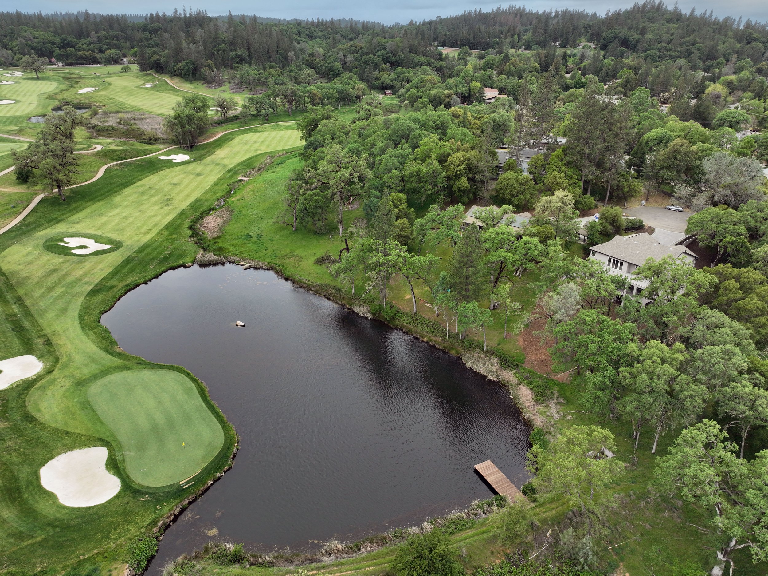 Set on the edge of a serene lake and framed by golf course greens, this home is surrounded by lush trees and open landscapes. From above, you can see the seamless blend of nature and architecture — a peaceful retreat with views that stretch across the water and rolling hills.