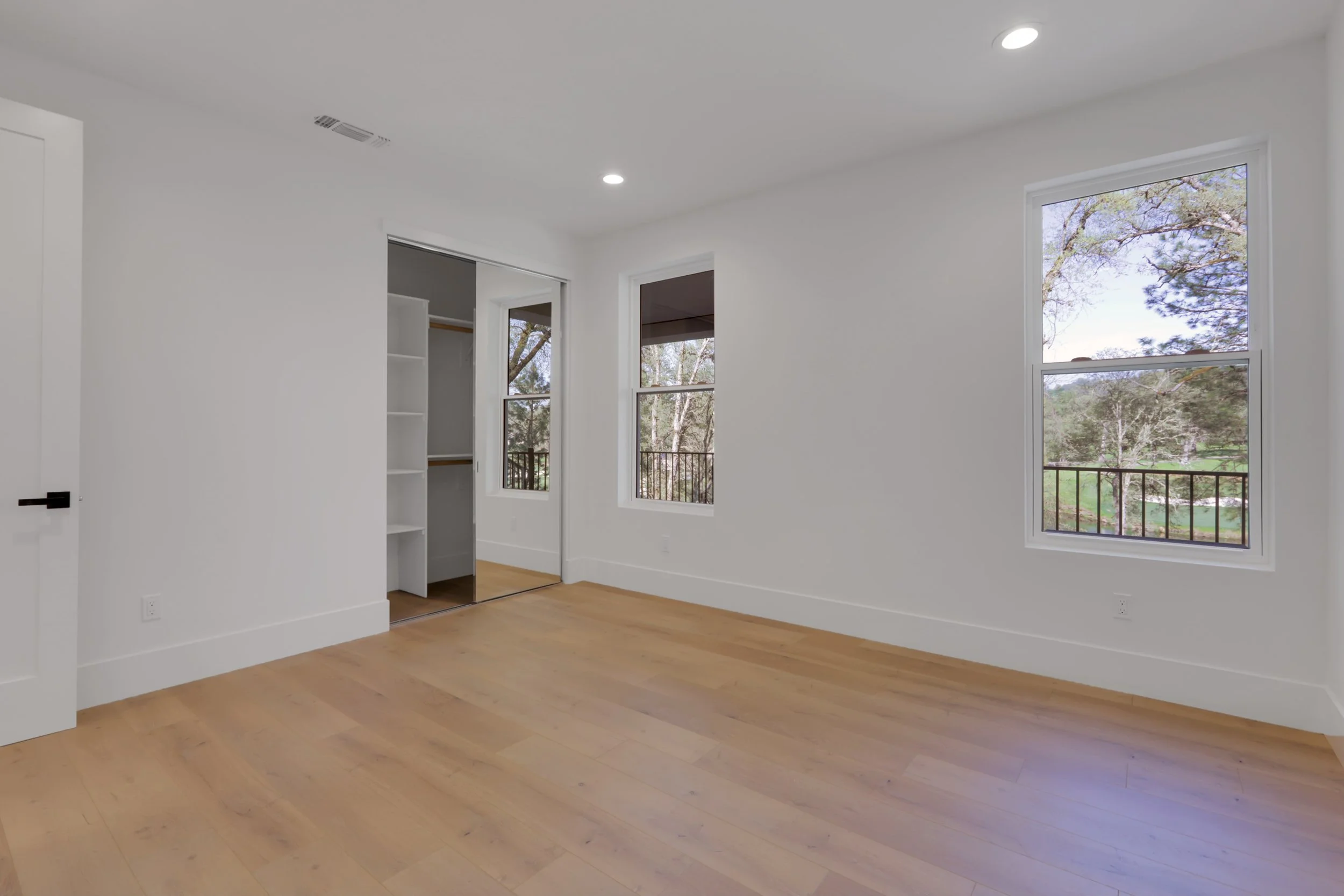 Spacious and bright primary suite featuring floor-to-ceiling windows, balcony access, and serene views of the surrounding greenery.