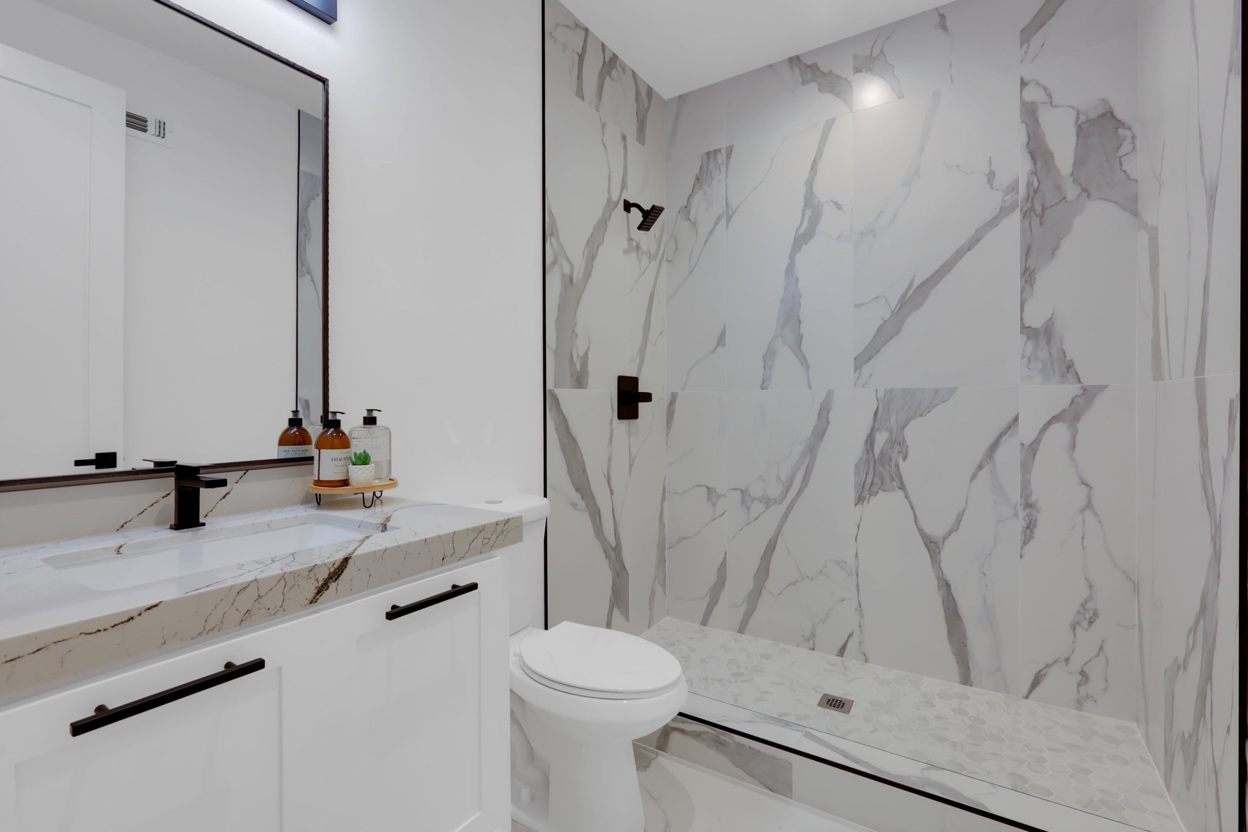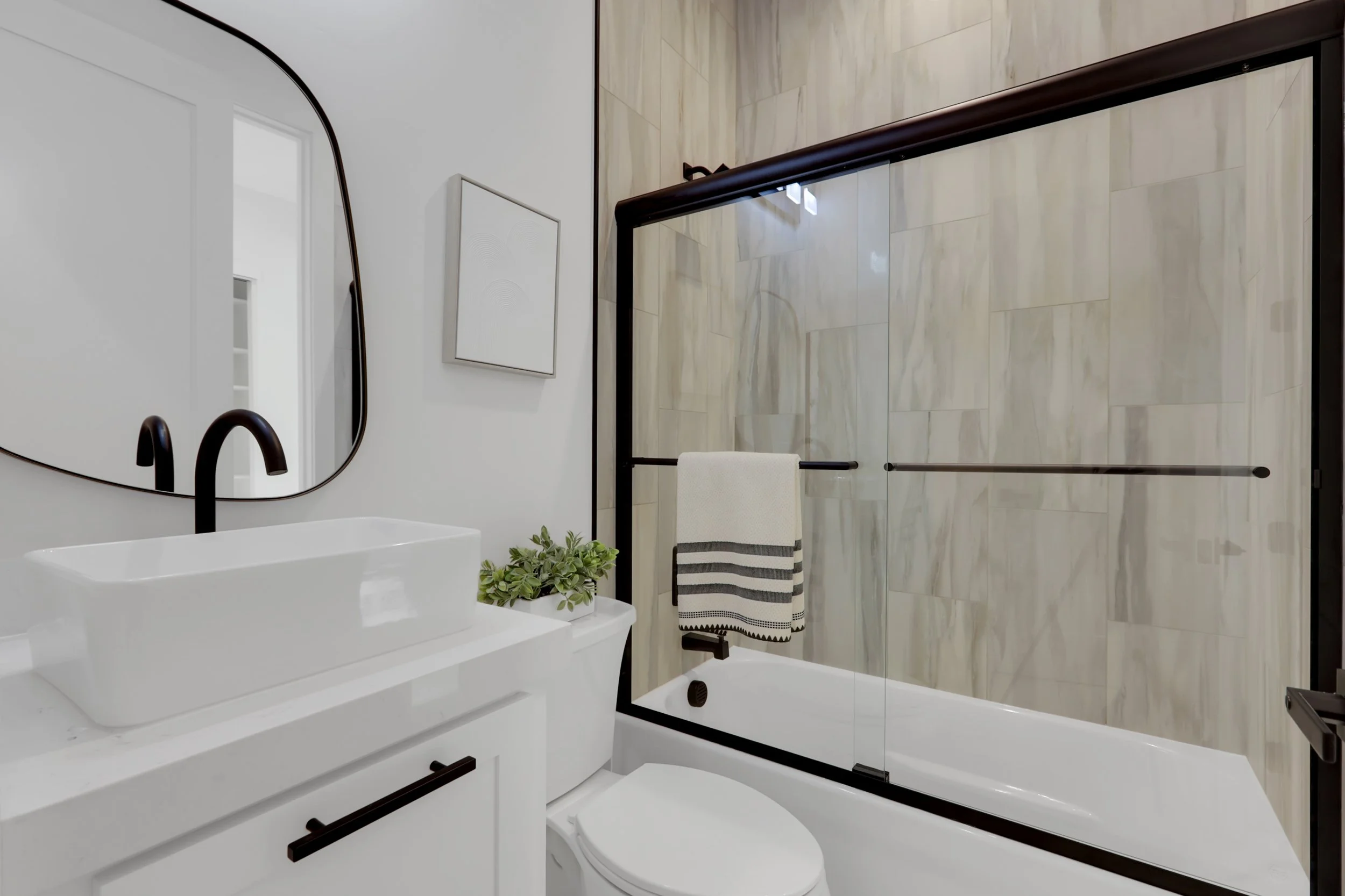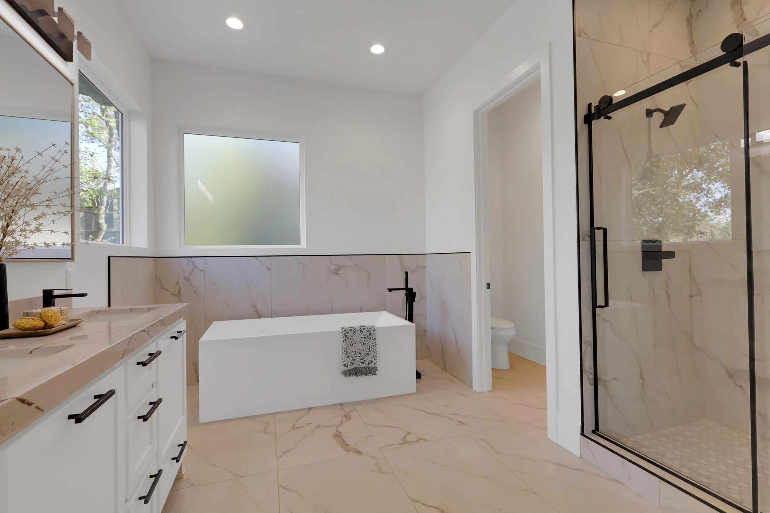 Refined and timeless, this bathroom features floor-to-ceiling marble-look porcelain tile, sleek black fixtures, and a floating vanity with a waterfall-edge countertop. A glass-enclosed shower adds a spa-like touch to this beautifully balanced space.