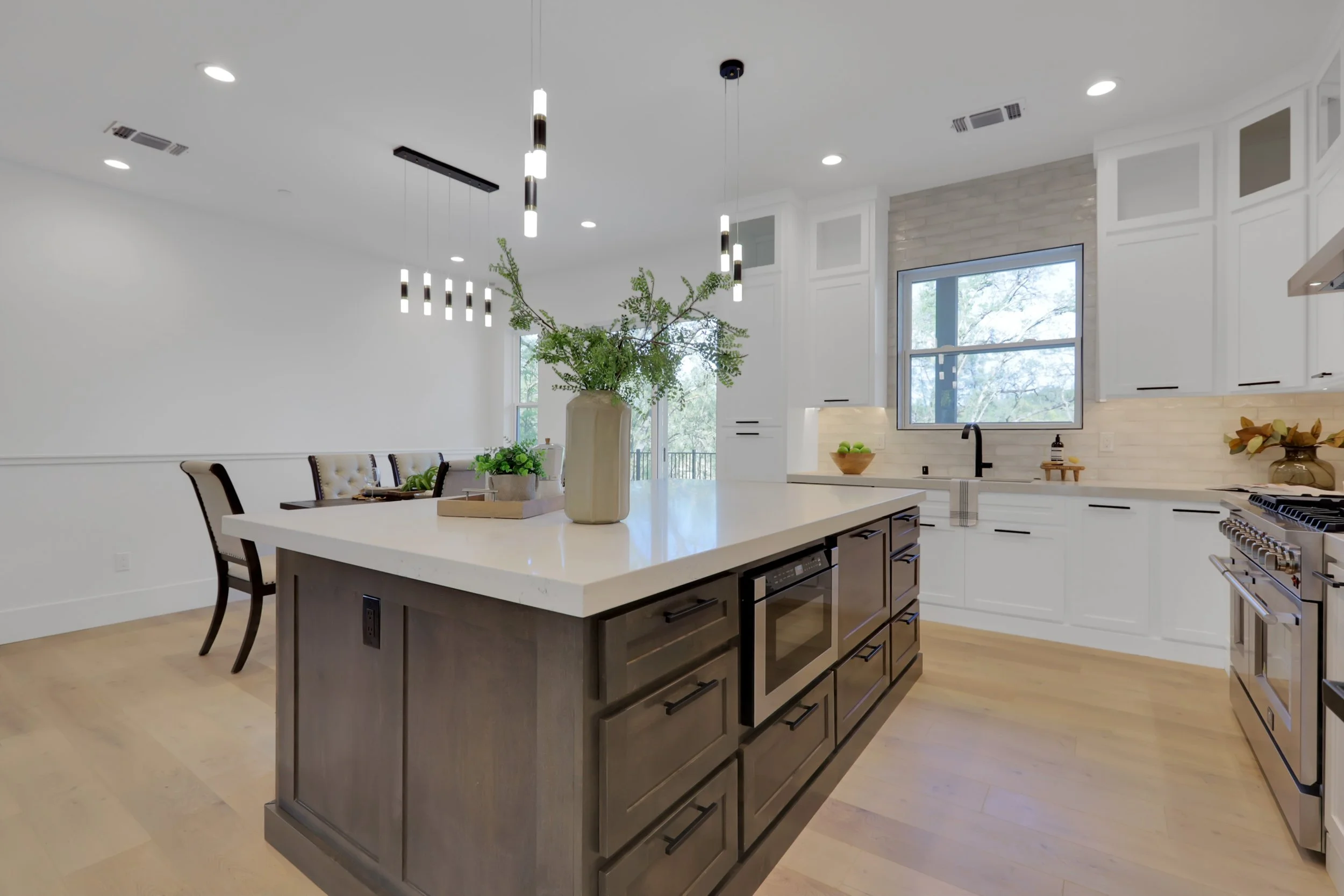 Bright and modern kitchen with a large island, quartz countertops, and elegant pendant lighting — ideal for gatherings and everyday cooking.