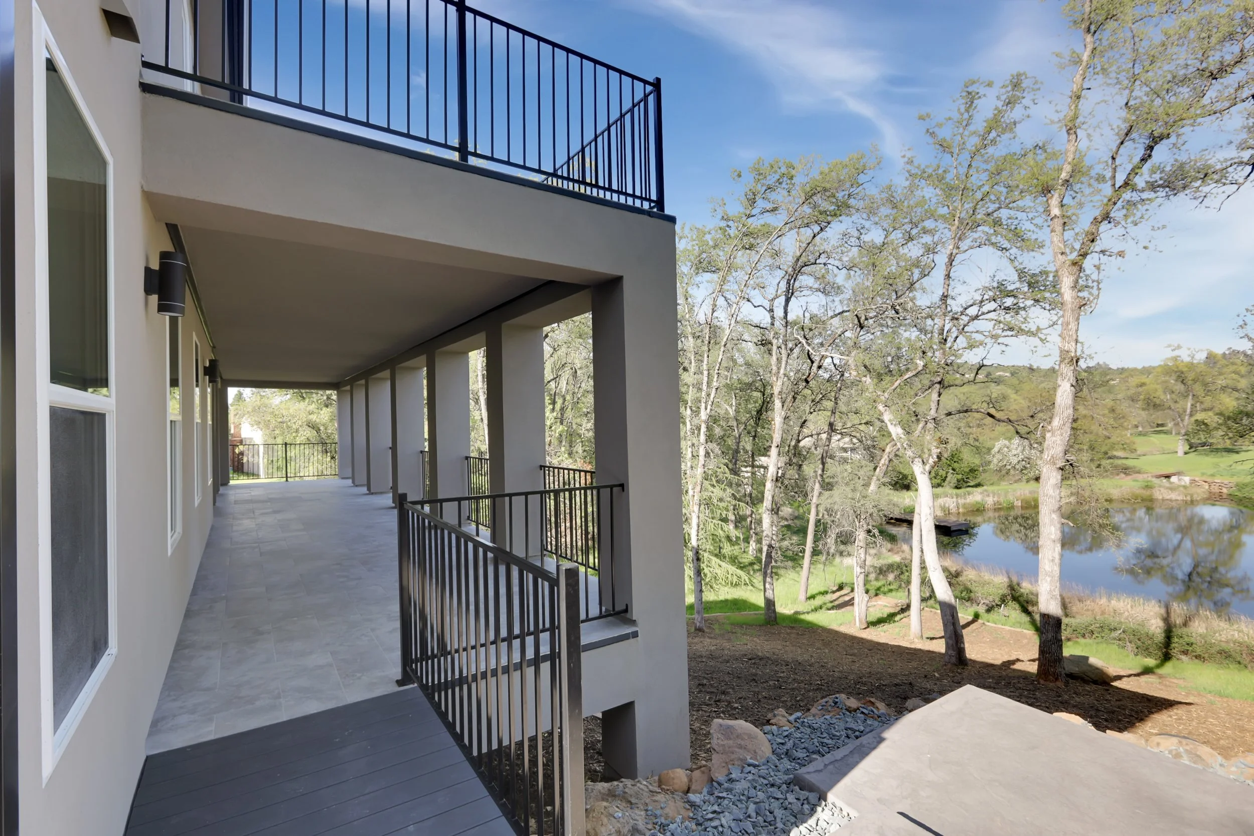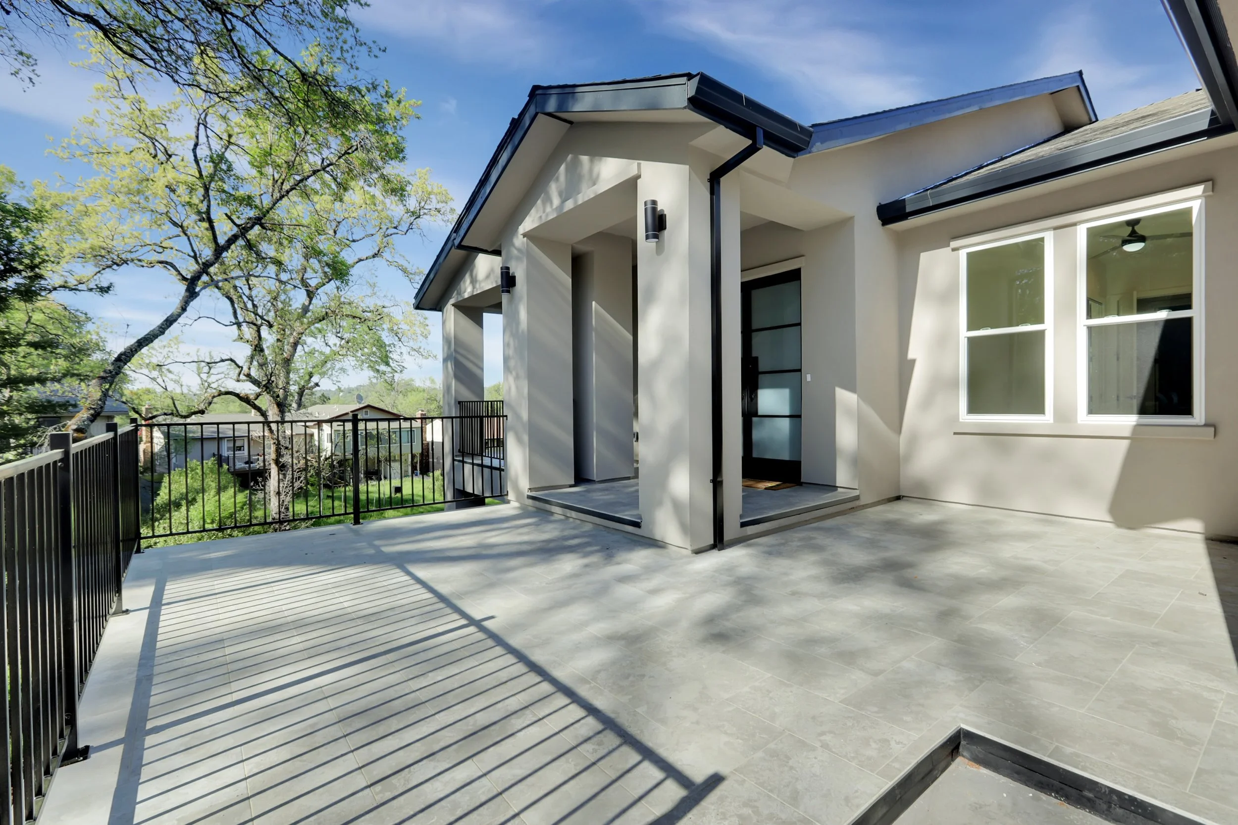A sunlit front terrace framed by sleek black railings and clean architectural lines. This elevated entry space sets the tone for the home — open, contemporary, and seamlessly connected to its natural surroundings.