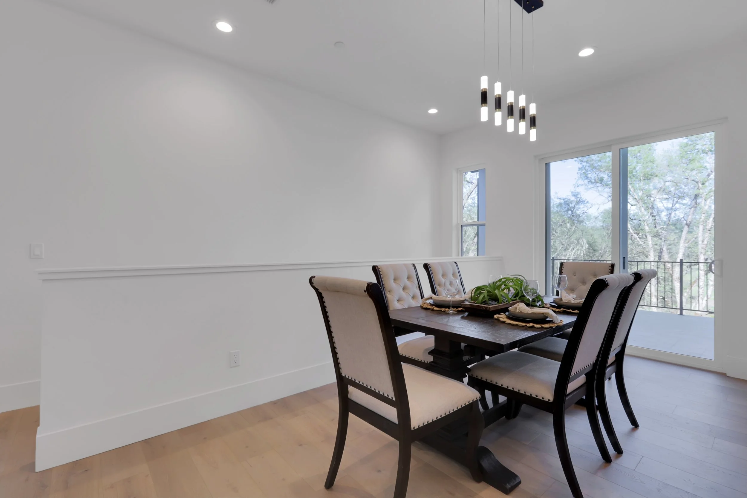 This bright dining space features large windows and glass doors that open to a balcony overlooking a serene forest view. The dark wood dining table contrasts beautifully with the light floors and neutral walls, while the modern pendant lighting above adds a touch of sophistication — creating an inviting atmosphere for both casual meals and special gatherings. -