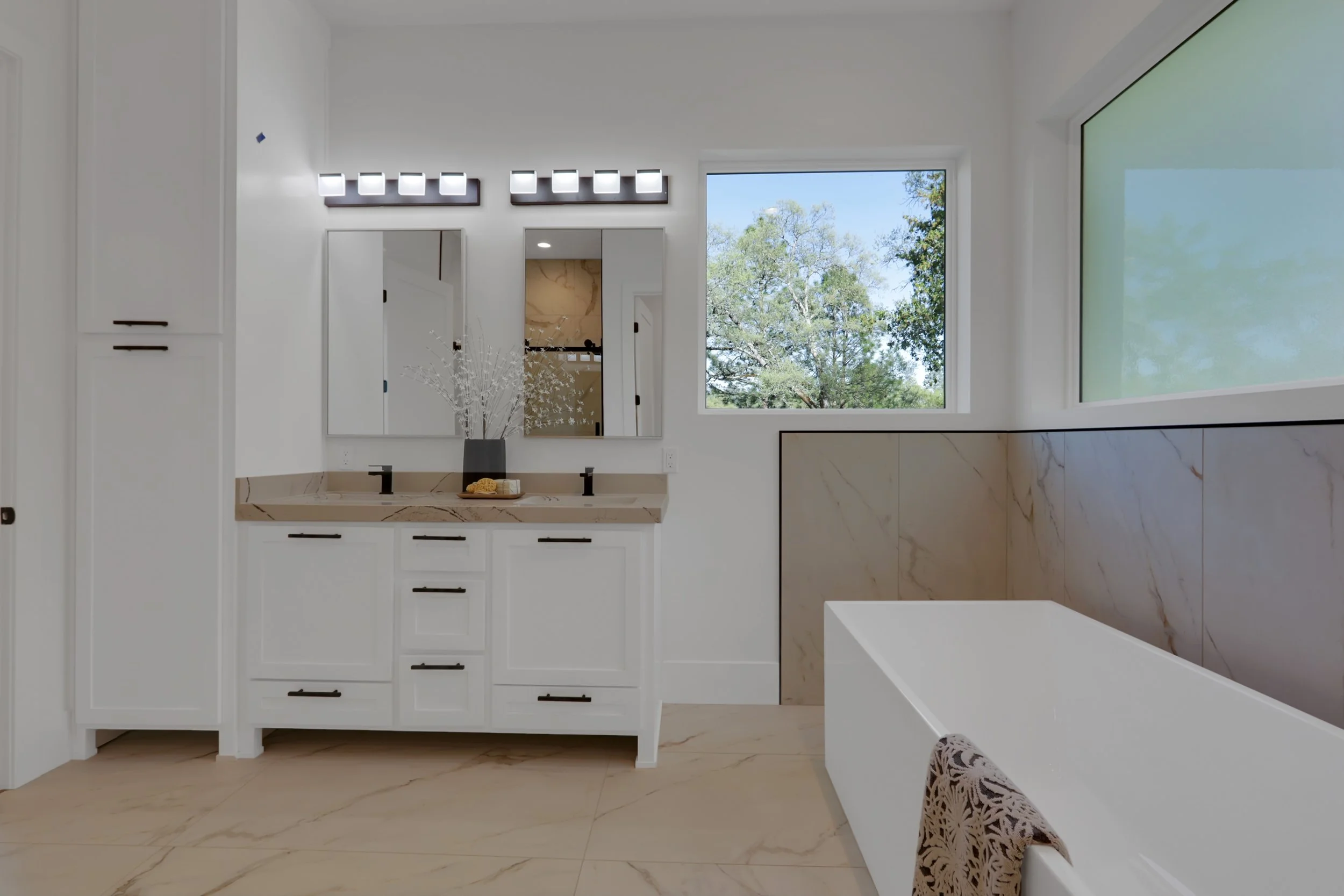 Elegant spa-style bathroom featuring a soaking tub, walk-in shower with modern black fixtures, and large windows that fill the space with natural light. -