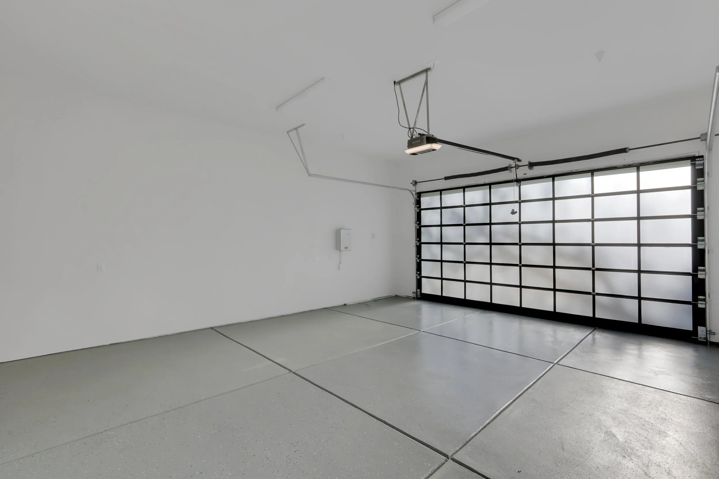 Spacious modern garage with sleek frosted glass doors and a clean epoxy floor.