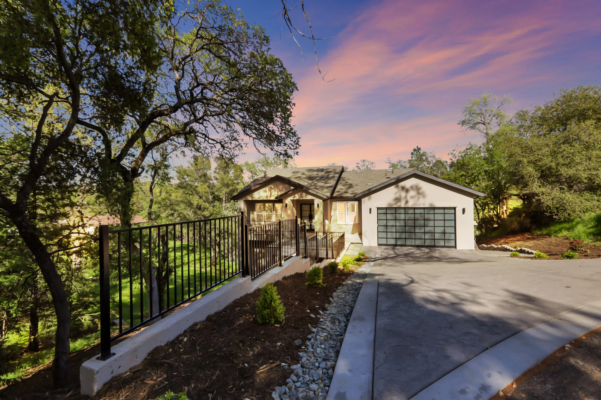 Modern hillside home with a spacious driveway, sleek glass-panel garage door, and a large elevated deck overlooking lush greenery.”